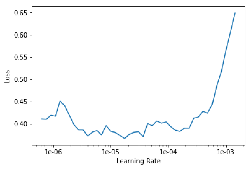 Before starting the training, we have to choose an appropriate learning rate, which is perhaps the single most important choice for effective training. FastAI provides the supremely useful lr_find method for this purpose, which is based on the technique discussed in Cyclical Learning Rates for Training Neural Networks.